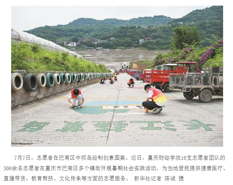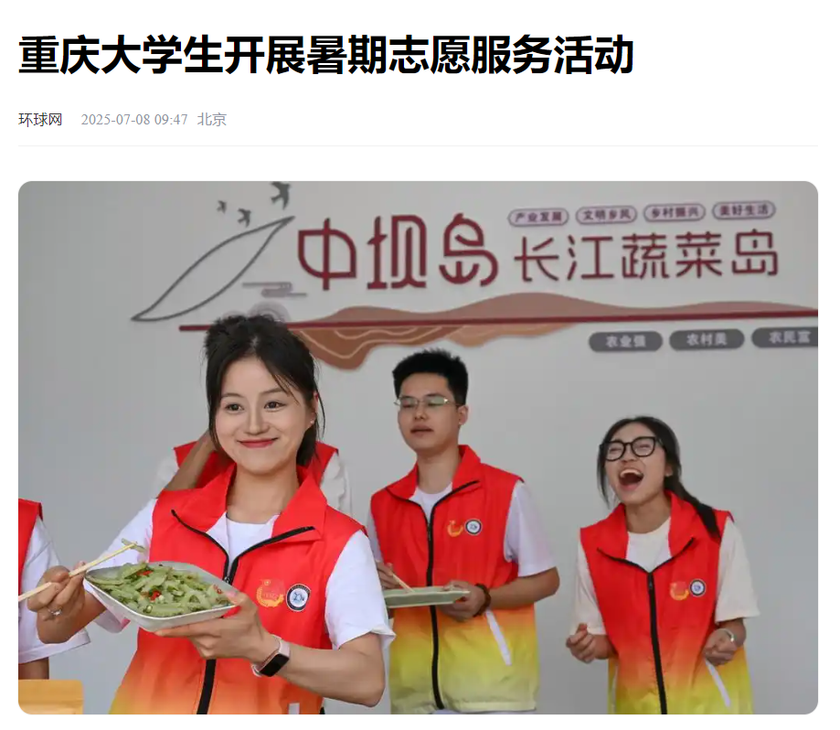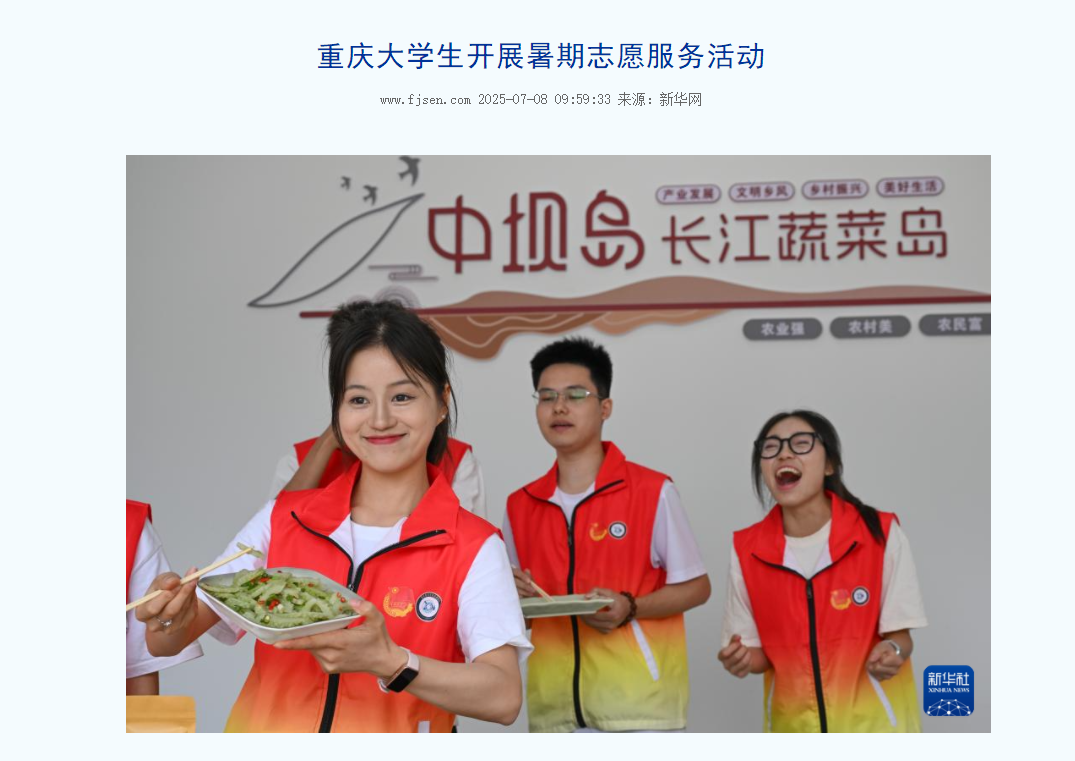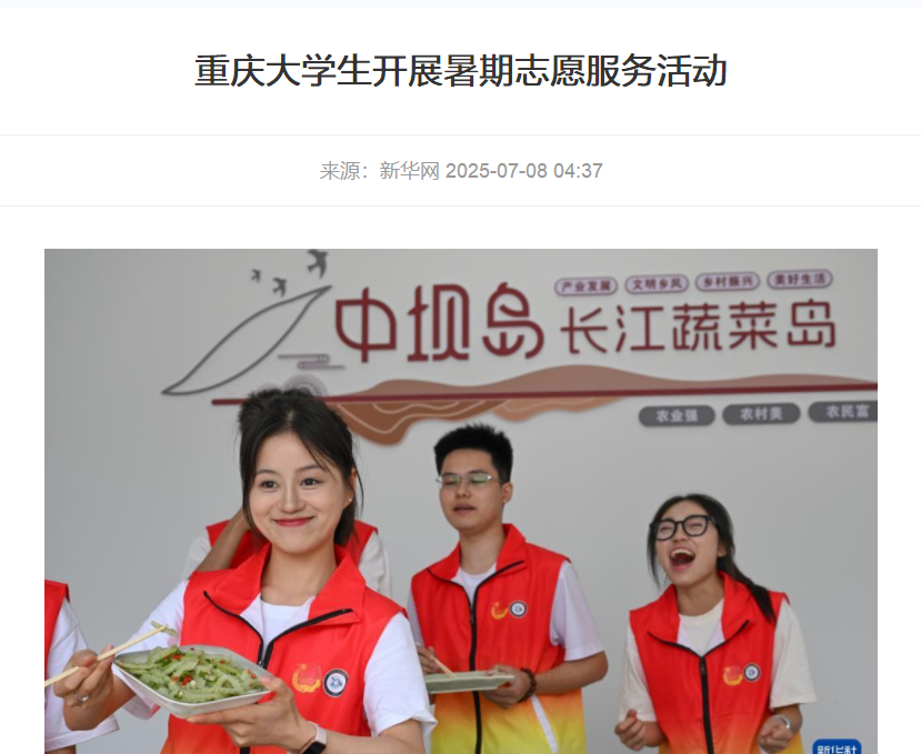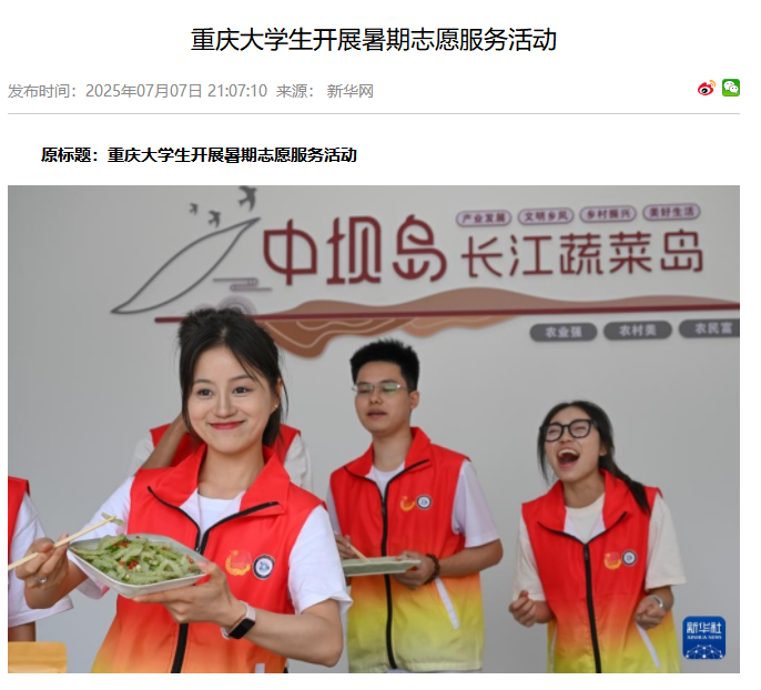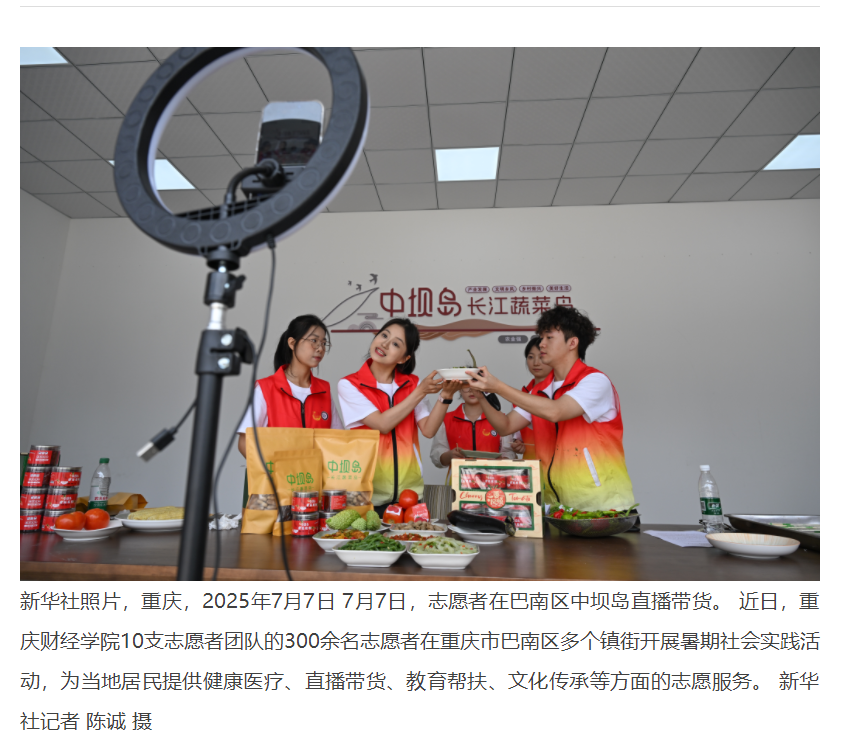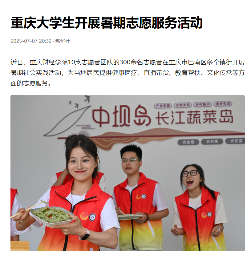 近日,澳门新葡京博彩10支志愿者团队的300余名志愿者在重庆市巴南区多个镇街开展暑期社会实践活动,为当地居民提供健康医疗、直播带货、教育帮扶、文化传承等方面的志愿服务。 媒体链接: 重庆大学生开展暑期志愿服务活动 - 今日头条 (toutiao.com) 重庆大学生开展暑期志愿服务活动 - 今日头条 (toutiao.com) 重庆大学生开展暑期志愿服务活动-新华网 (news.cn) 重庆大学生开展暑期志愿服务活动 (baidu.com) 大学生开展暑期志愿服务活动 - 中国妇女报 (cnwomen.com.cn) 兵团日报1 (bingtuannet.com) https://www.cqcb.com/highlights/2025-07-07/5900896_pc.html http://news.cnhubei.com/tupian/p/19315806.html?spm=zm1033-001.0.0.1.VDc1Ql http://picture.yunnan.cn/system/2025/07/07/033538269.shtml https://www.syd.com.cn/newscenter/content/2025-07/08/content_184626.html http://news.fjsen.com/2025-07/08/content_31939121.htm