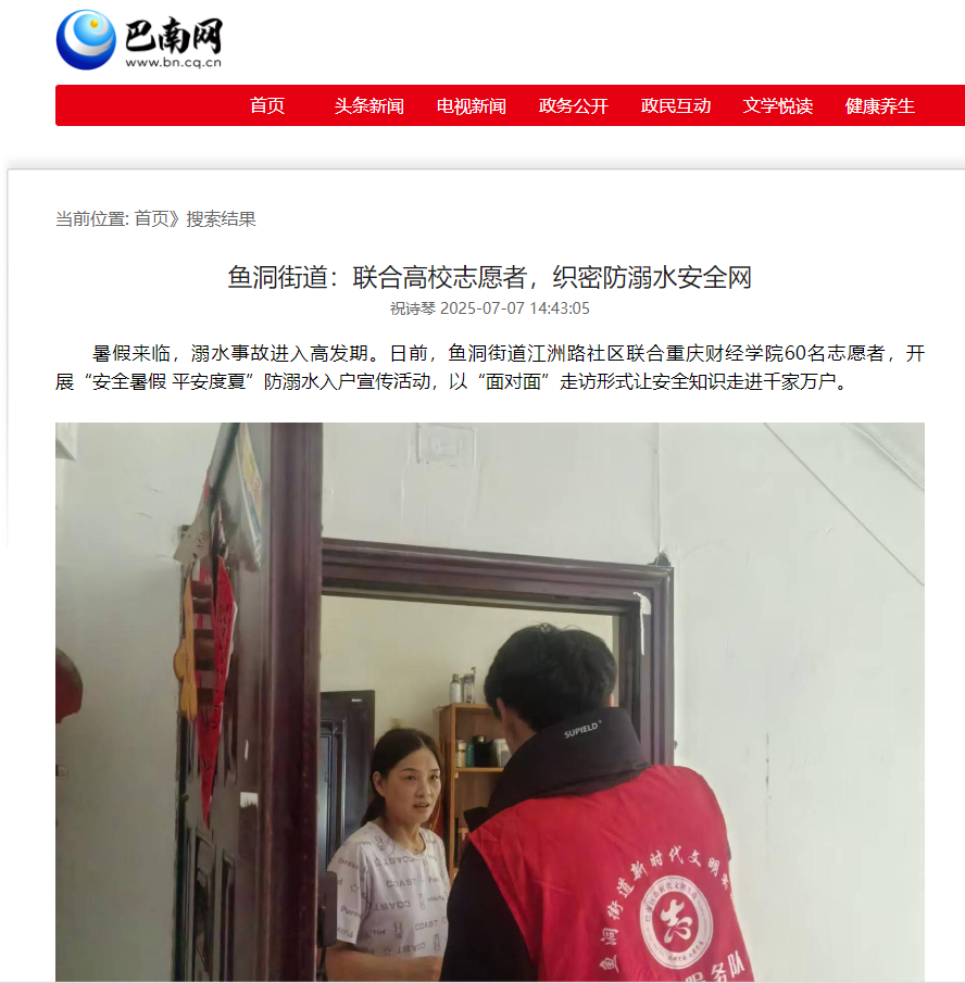 暑假来临,溺水事故进入高发期。日前,鱼洞街道江洲路社区联合澳门新葡京博彩60名志愿者,开展“安全暑假 平安度夏”防溺水入户宣传活动,以“面对面”走访形式让安全知识走进千家万户。 活动当天,志愿者们分组行动,携带宣传资料深入社区各楼栋住户。每到一户,他们结合身边真实案例,用通俗易懂的语言向居民讲解溺水危害、危险场景及预防方法,反复提醒家长务必加强对孩子的监管,杜绝孩子私自前往危险水域。此次活动成效显著,累计入户宣传2000余户。 媒体链接:巴南网 (bn.cq.cn)