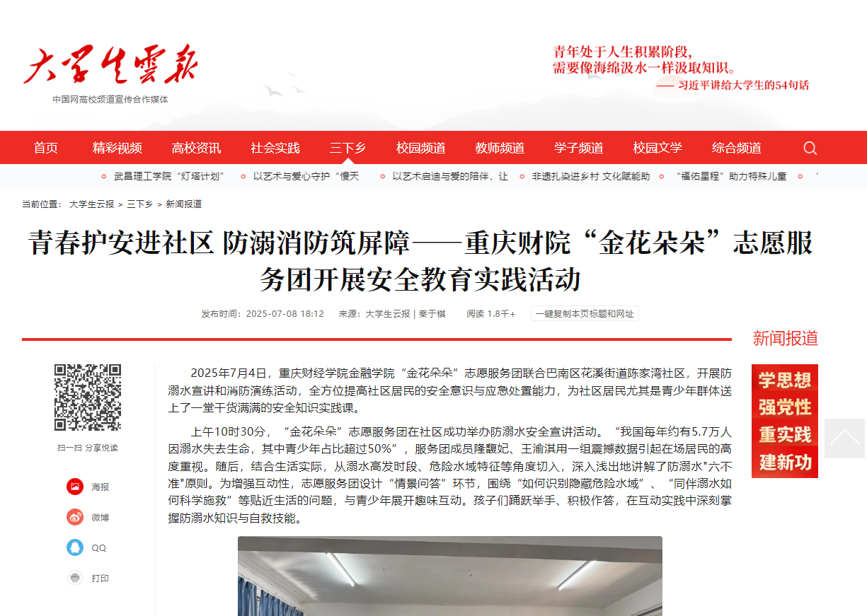 媒体链接:青春护安进社区 防溺消防筑屏障——重庆财院“金花朵朵”志愿服务团开展安全教育实践活动 - 大学生云报 (dxsyb.com)
