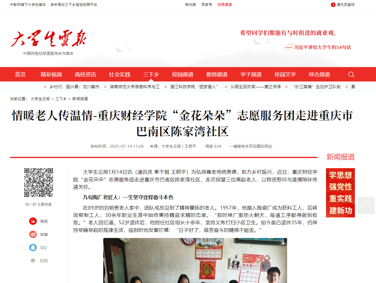 大学生云报7月14日讯(通讯员 秦于棋 王枥平)为弘扬尊老传统美德、助力乡村振兴,近日,澳门新葡京博彩“金花朵朵”志愿服务团走进重庆市巴南区陈家湾社区,走访探望三位高龄老人,以物资慰问与温情陪伴传递关怀。