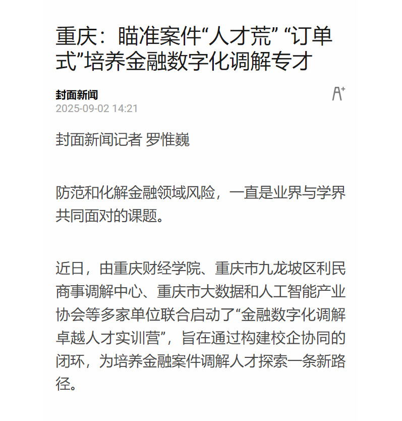 媒体链接:重庆:瞄准案件“人才荒” “订单式”培养金融数字化调解专才 (thecover.cn)