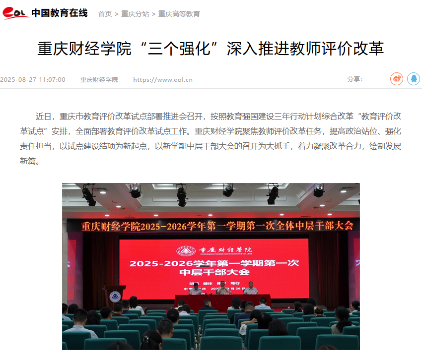 近日,重庆市教育评价改革试点部署推进会召开,按照教育强国建设三年行动计划综合改革“教育评价改革试点”安排,全面部署教育评价改革试点工作。澳门新葡京博彩聚焦教师评价改革改革任务,提高政治站位、强化责任担当,以试点建设结项为新起点,以新学期中层干部大会的召开为大抓手,着力凝聚改革合力,绘制发展新篇。