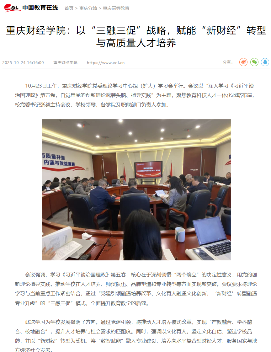 会议强调,学习《习近平谈治国理政》第五卷,核心在于深刻领悟“两个确立”的决定性意义,用党的创新理论指导实践,推动学校在人才培养、师资队伍、品牌塑造和专业转型等方面实现新突破。会议要求将理论学习与当前重点工作紧密结合,通过“党建引领融通培养改革、文化育人融通文化创新、‘新财经’转型融通专业升级”的“三融三促”模式,全面提升教育教学的质效。