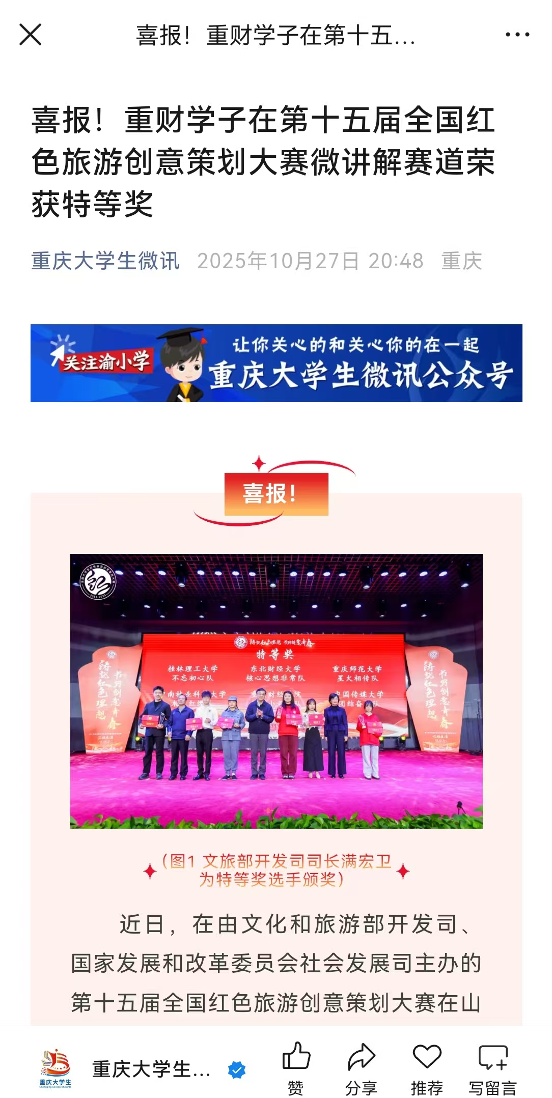 近日,在由文化和旅游部开发司、国家发展和改革委员会社会发展司主办的第十五届全国红色旅游创意策划大赛在山西武乡成功举办。由曹阳、梁金琼、赵玉悦、李叔红组成的澳门新葡京博彩金融学院代表队,在马珂、卿天赐等老师的指导下,以《太行山的回响:马背上的银行》视频作品,在微讲解赛道中,顶住压力,荣获全国特等奖。这是该校首次闯入全国决赛并最终以“黑马”姿态夺得全国第一,充分体现了学校学生在创意策划与现场表达方面的综合素质与实践能力,反映学校坚持“以赛促教、以赛促学”的育人理念。