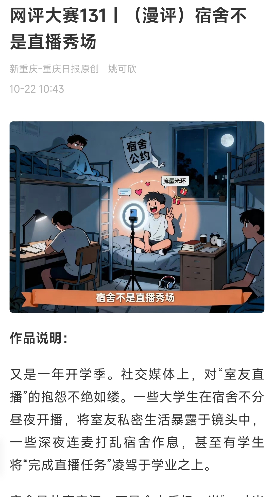 宿舍是共享空间,不是个人秀场。当“一寸光阴一寸金”的学习时光被流量扰乱,当他人隐私权被轻易侵犯,这种所谓的“直播自由”显然已经严重越界。热衷在直播间展现自我的学生主播应当明白:真正的个性不在镜头里,而在尊重他人基础上的个人成长。高校一方也应加强管理,引导学生自觉树立边界意识。