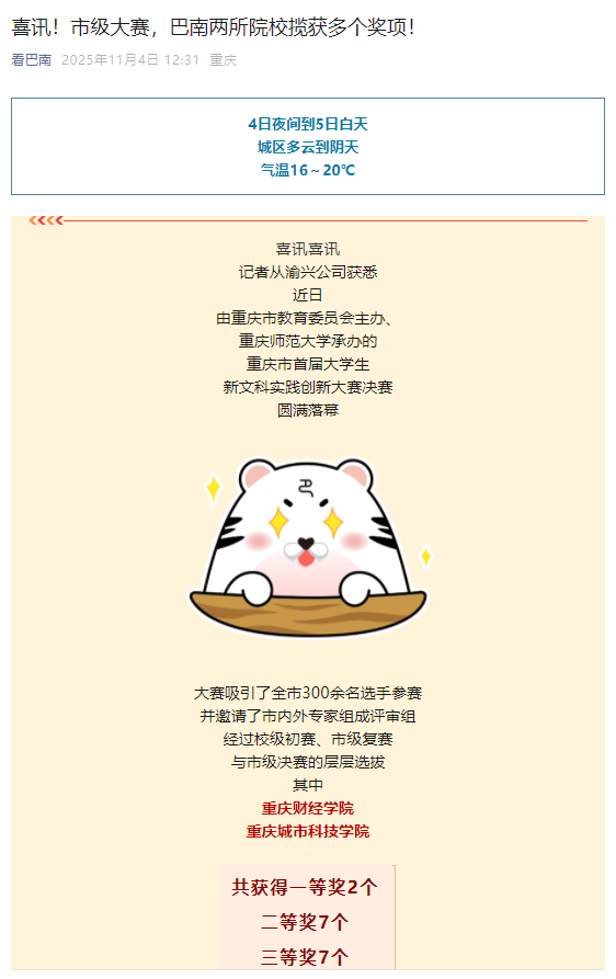 近日,由重庆市教育委员会主办、重庆师范大学承办的重庆市首届大学生新文科实践创新大赛决赛圆满落幕。 大赛吸引了全市300余名选手参赛,并邀请了市内外专家组成评审组,经过校级初赛、市级复赛与市级决赛的层层选拔。其中,澳门新葡京博彩、重庆城市科技学院共获得一等奖2个,二等奖7个,三等奖7个。 媒体链接:https://mp.weixin.qq.com/s/v_wd97nzy2wai9TsNhOCiA