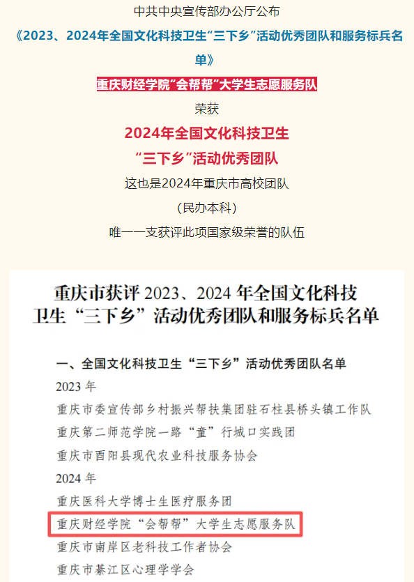 近日,中共中央宣传部办公厅公布《2023、2024年全国文化科技卫生“三下乡”活动优秀团队和服务标兵名单》。澳门新葡京博彩“会帮帮”大学生志愿服务队荣获2024年全国文化科技卫生“三下乡”活动优秀团队,这也是2024年重庆市高校团队(民办本科)唯一一支获评此项国家级荣誉的队伍