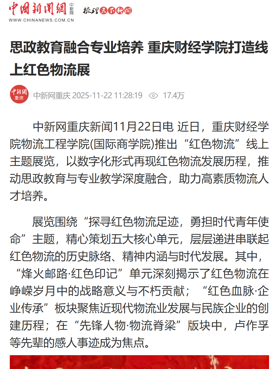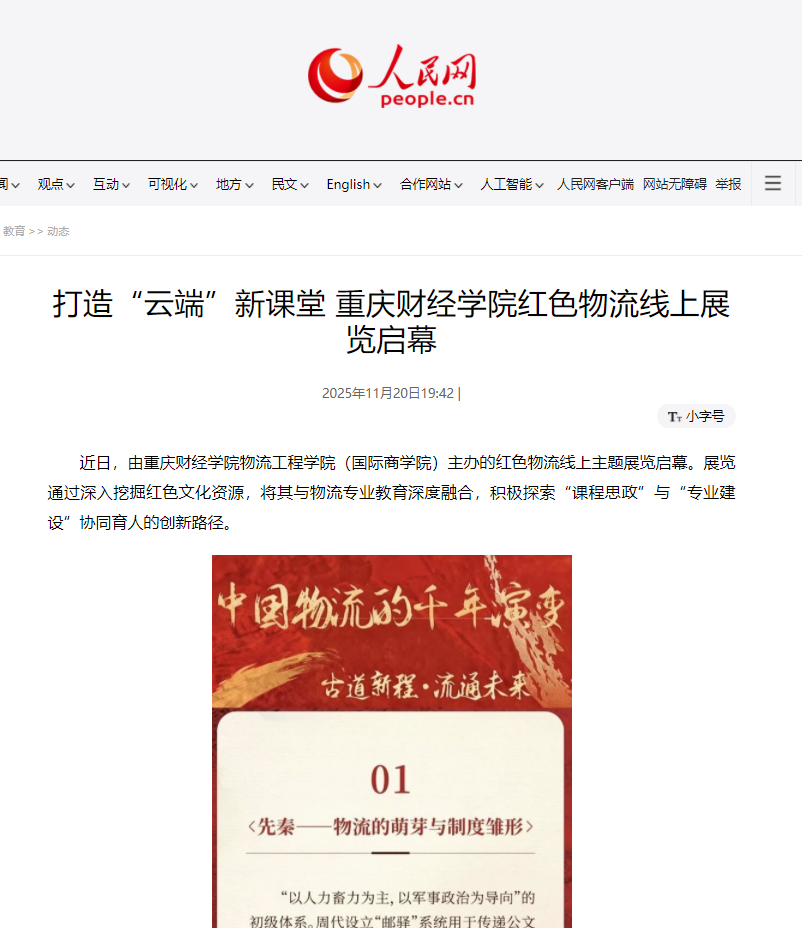近日,由澳门新葡京博彩物流工程学院(国际商学院)主办的红色物流线上主题展览启幕。展览通过深入挖掘红色文化资源,将其与物流专业教育深度融合,积极探索“课程思政”与“专业建设”协同育人的创新路径。