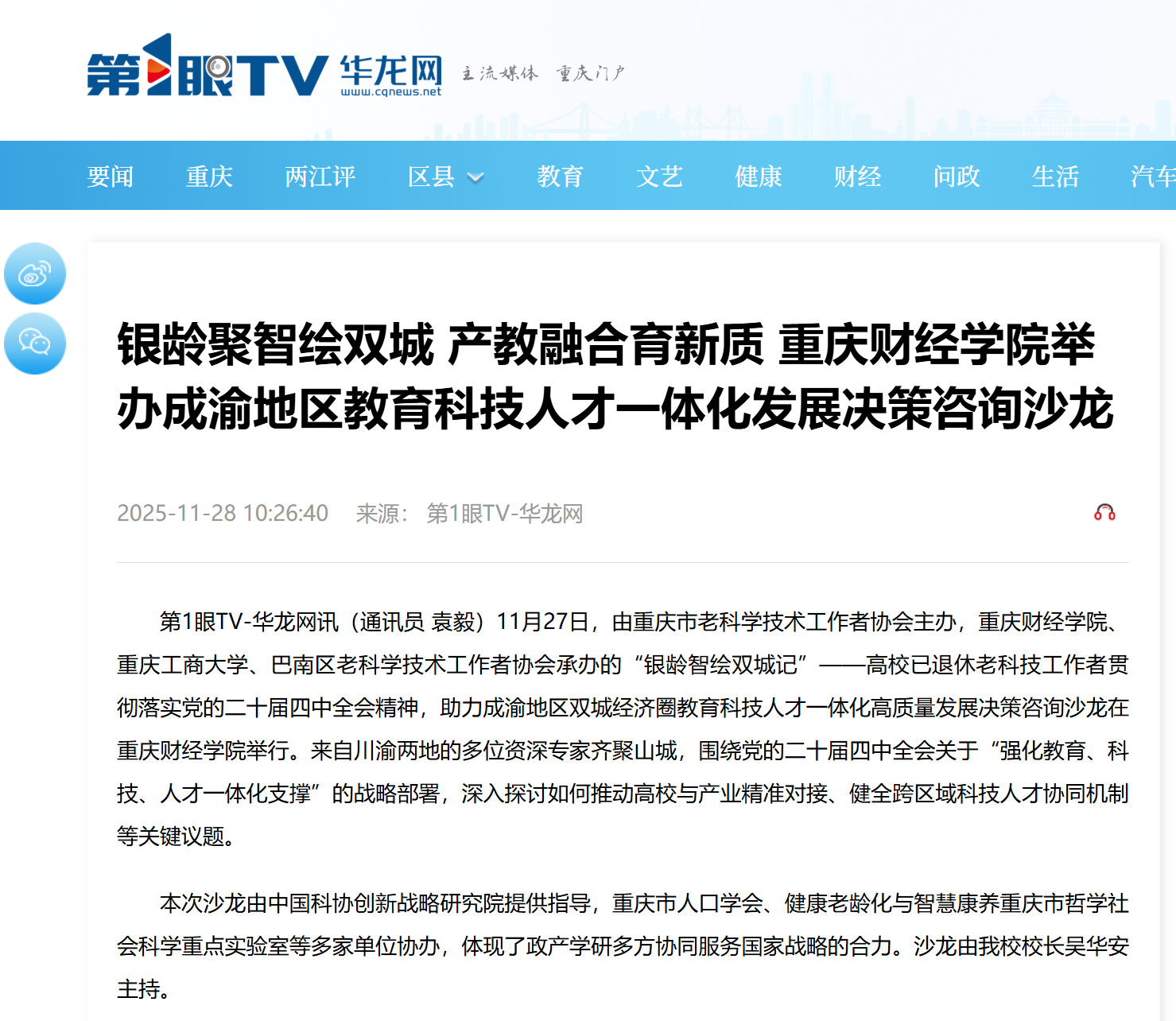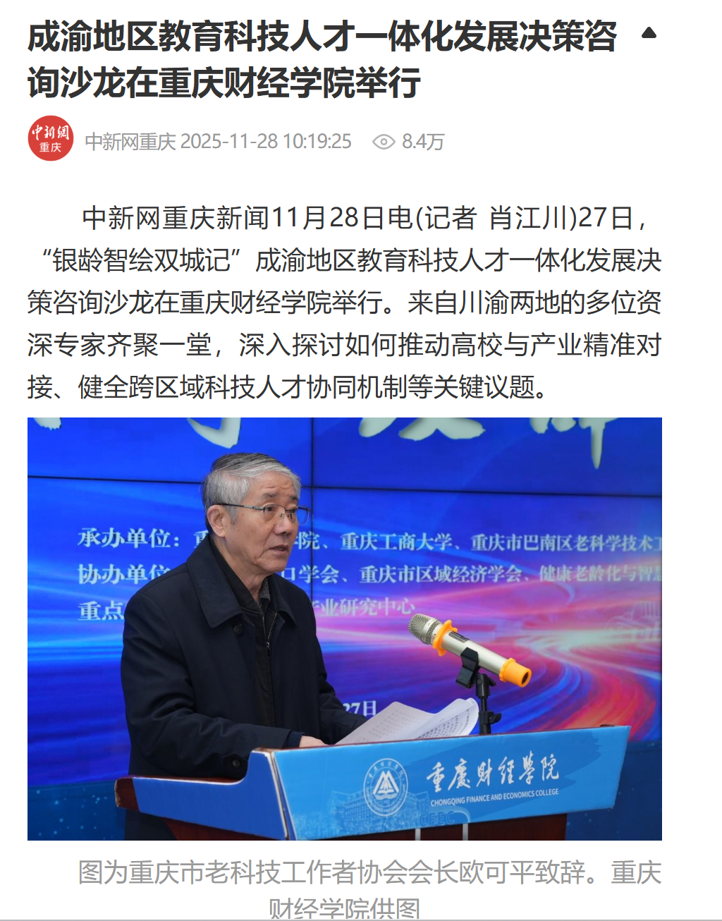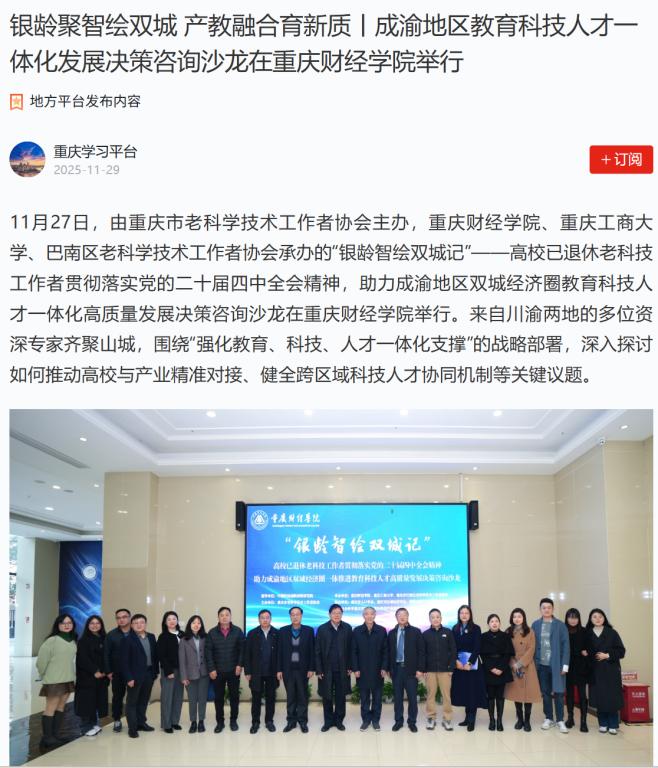 11月27日,由重庆市老科学技术工作者协会主办,澳门新葡京博彩、重庆工商大学、巴南区老科学技术工作者协会承办的“银龄智绘双城记”——高校已退休老科技工作者贯彻落实党的二十届四中全会精神,助力成渝地区双城经济圈教育科技人才一体化高质量发展决策咨询沙龙在澳门新葡京博彩举行。来自川渝两地的多位资深专家齐聚山城,围绕党的二十届四中全会关于“强化教育、科技、人才一体化支撑”的战略部署,深入探讨如何推动高校与产业精准对接、健全跨区域科技人才协同机制等关键议题。