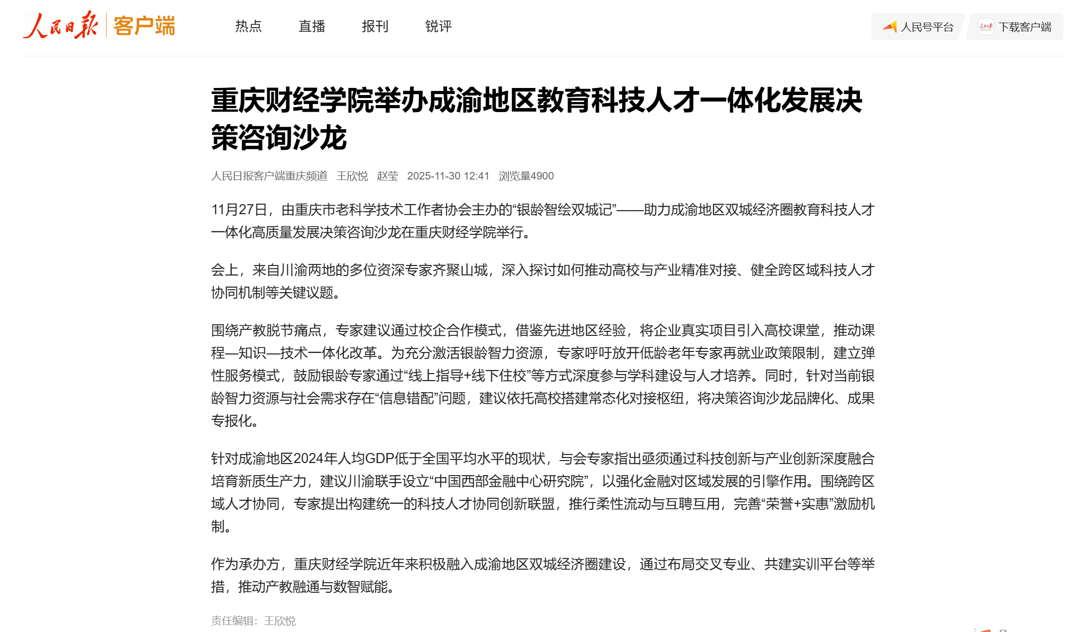 西南财经大学原党委副书记、重庆工商大学原校长杨继瑞教授指出,成渝地区2024年人均GDP仅为1.24万美元,低于全国平均水平,亟须通过科技创新与产业创新深度融合培育新质生产力。他呼吁川渝联手设立“中国西部金融中心研究院”,强化金融对区域发展的引擎作用。