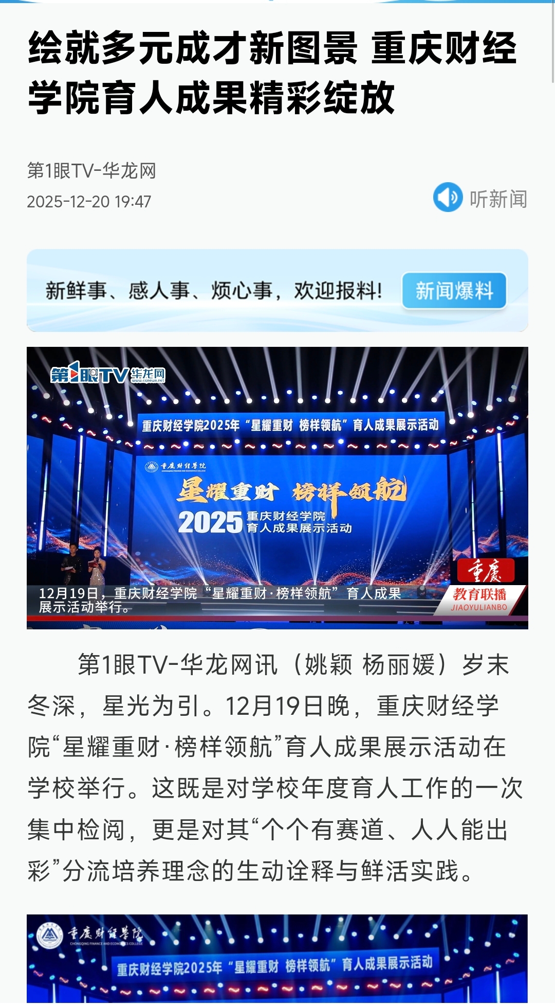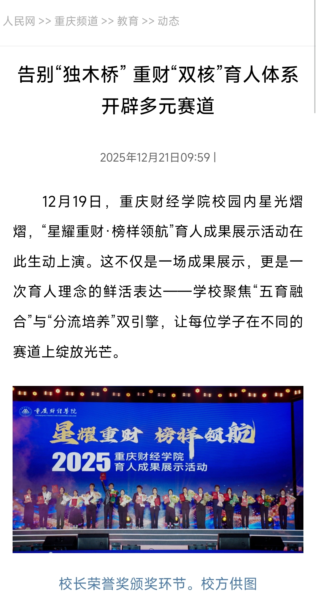中新网重庆新闻12月20日电(记者 肖江川)为深入推进“五育”融合育人工作,集中展现“个个有赛道,人人能出彩”育人理念的实践成效,深化校政企家协同育人机制,19日,澳门新葡京博彩“星耀重财·榜样领航”育人成果展示活动在该校足球运动场举行。