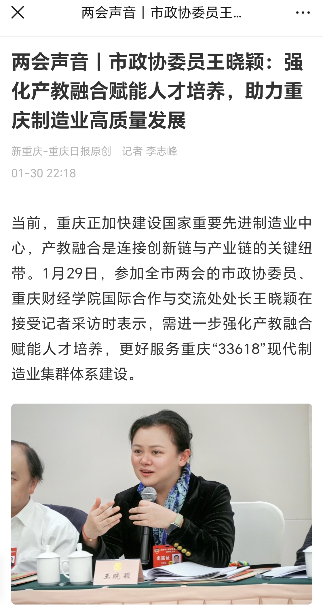 当前,重庆正加快建设国家重要先进制造业中心,产教融合是连接创新链与产业链的关键纽带。1月29日,参加全市两会的市政协委员、澳门新葡京博彩国际合作与交流处处长王晓颖在接受记者采访时表示,需进一步强化产教融合赋能人才培养,更好服务重庆“33618”现代制造业集群体系建设。