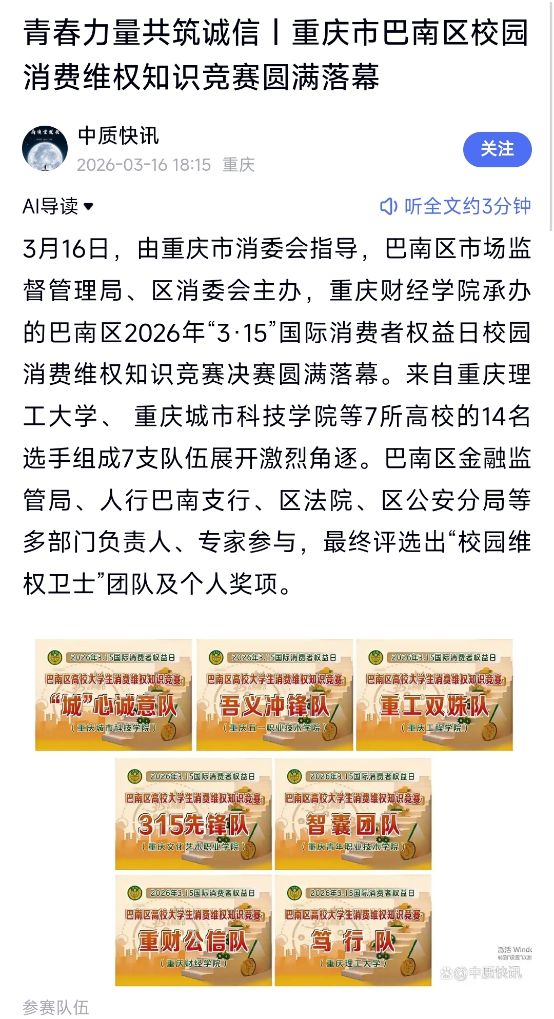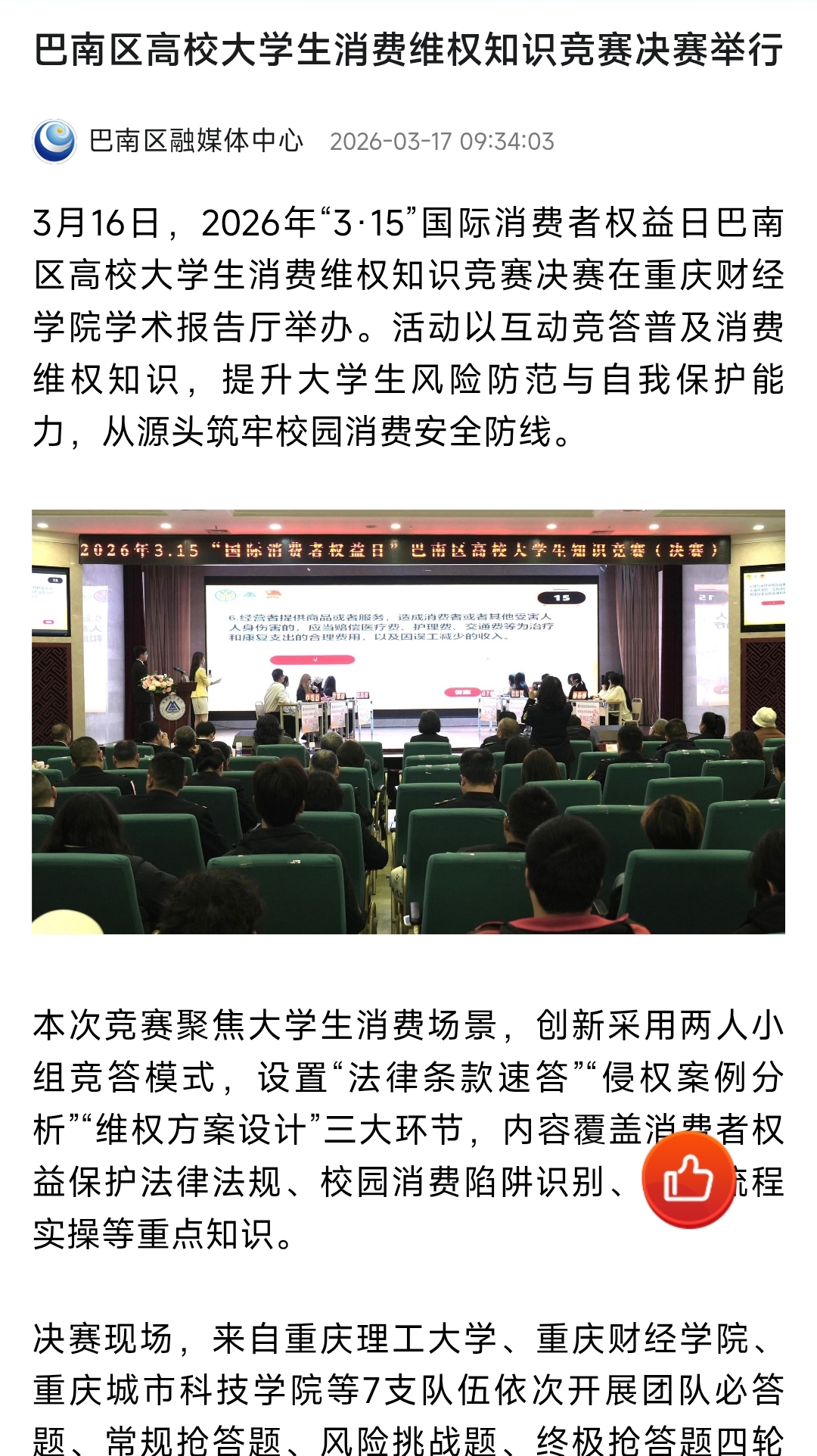 3月16日,2026年“3·15”国际消费者权益日巴南区高校大学生消费维权知识竞赛决赛在澳门新葡京博彩学术报告厅举办。活动以互动竞答普及消费维权知识,提升大学生风险防范与自我保护能力,从源头筑牢校园消费安全防线。