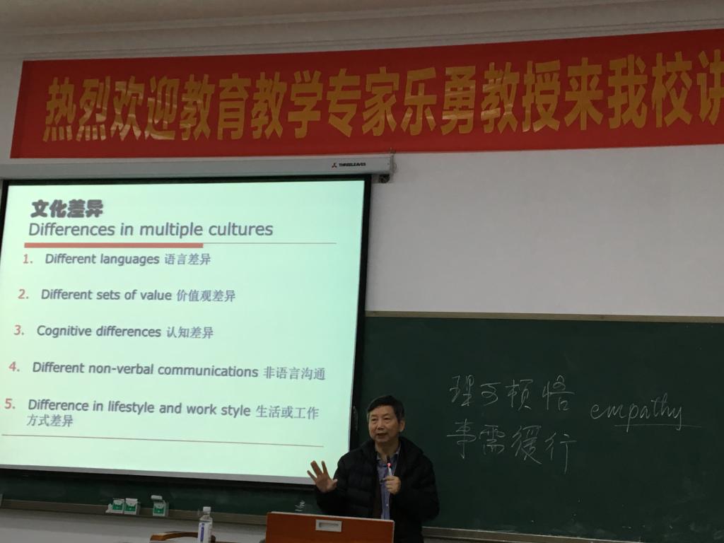 为拓宽我校师生的国际交流视野,培养师生跨文化交流的意识和能力。2017年3月24日,基础课教学部邀请重庆市教育国际交流协会乐勇教授(曾任四川外国语大学党委委员、副校长、重庆市中外合作办学评审专家。)在1506教室举办了跨文化交流能力建设的讲座。我校国际交流合作处石转转处长、商务学院张红梅院长、财富管理学院赵娜副院长、基础课教学部英语教师、商务学院专业教师和商务学院部分2015级、2016级学生应邀参加,本次讲座由基础课教学部吕福起副主任主持。