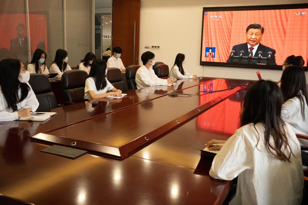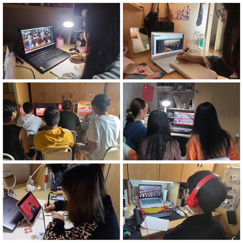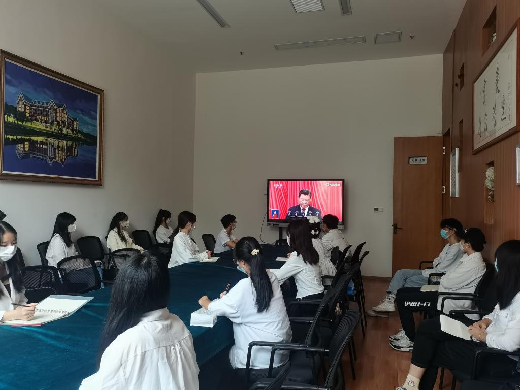按照校团委统一布署安排,校内各学生组织骨干代表在行政楼2422党员活动室、行政楼2303会议室、图书馆研讨室等集中收看点观看开幕会;各基层团组织则组织团员青年在办公室、食堂、宿舍、家中通过网络、电视、自媒体等途径共同关注二十大开幕会。团员们一边仔细聆听习近平总书记的报告,一边记录报告中的主要内容。大家在感慨十九大以来党和国家各项事业发展取得的辉煌成就的同时也倍感自豪,大家表示会不忘初心,牢记使命,高举中国特色社会主义伟大旗帜,紧密团结在以习近平总书记为核心的党中央周围,为实现各项目标而共同奋斗。