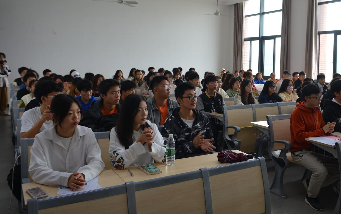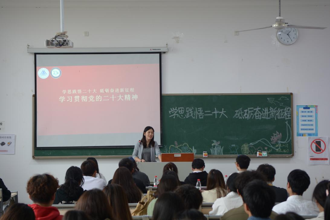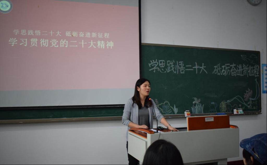 会上,陈玲老师向大家全面解读了党的二十大报告,将理论与实际结合,对习近平新时代中国特色社会主义思想、“四个确立”、“四个意识”、“四个坚持”、“四个自信”以及“两个维护”作了深入而系统的阐释。陈玲老师指出,青年兴则国兴,青年强则国强,作为新时代青年要认真学习宣传贯彻党的二十大精神。同时,她表示新时代青年应该有理想、敢担当、能吃苦、肯奋斗,强调同学们要深入领会党的创新理论,做到知其言更知其义,知其然更知其所以然,厚值爱国情怀,争做新时代新青年。