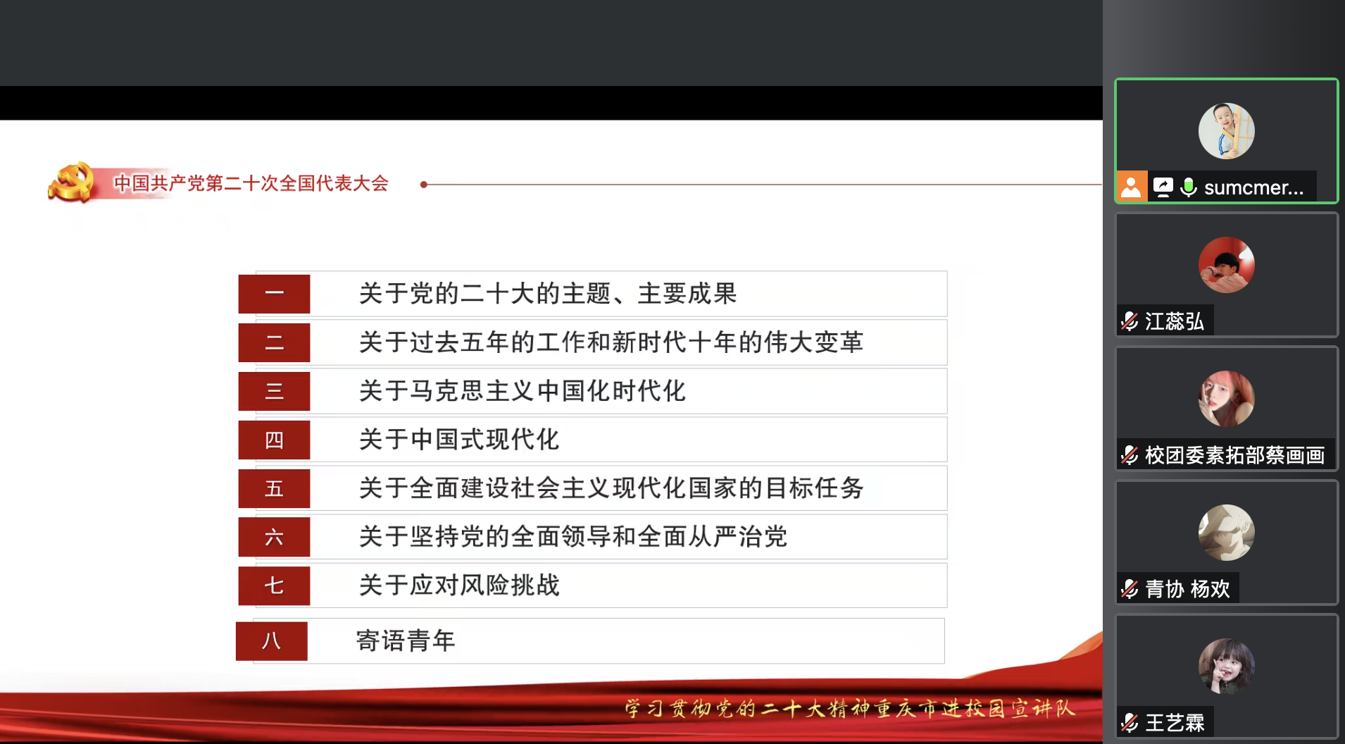 为深入学习宣传贯彻党的二十大精神,更好引导广大重财青年紧跟党的脚步,奋进新征程。我校团委于1126日开展了深入学习宣传贯彻党的二十大精神专题学习会本次专题学习会由团委书记夏文瑞领学团委各学生组织成员通过线上线下相结合的方式参与学习