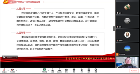 宣讲会上,张立围绕党的二十大主题和主要成果、过去五年的工作和新时代十年的伟大变革、马克思主义中国化时代化、中国式现代化、全面建设社会主义现代化国家的目标任务、坚持党的全面领导和全面从严治党、应对风险挑战等七个方面对二十大报告内容进行了详细解读和系统阐述。宣讲过程中既回顾了过去一百年以来党取得的一系列伟大历史成就,又立足当下,深入分析了当前世界格局,指出了新时代下党所面临的新的机遇和挑战及应对措施。