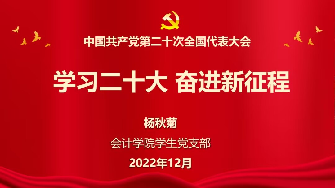 为深入学习贯彻党的二十大精神,学生二支部组织委员杨秋菊老师于2022年12月27日12:30在钉钉召开线上宣讲会,会计学院党员服务站全体成员参加此次会议。