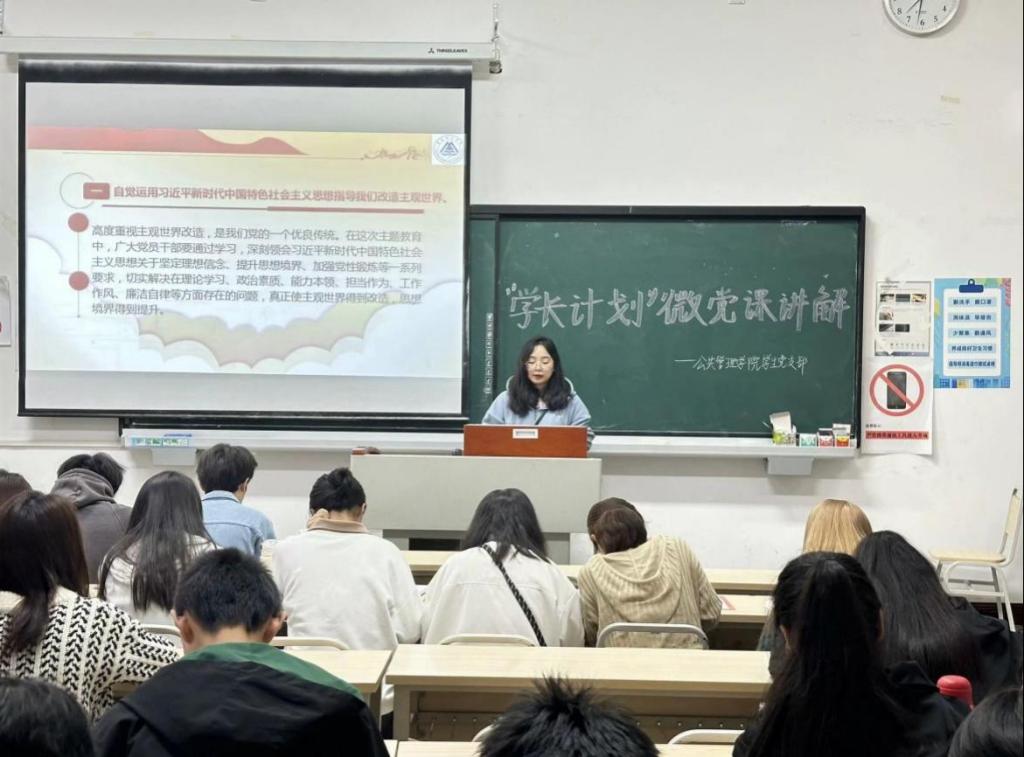 为学习贯彻习近平新时代中国特色社会主义思想,引导学生党员牢牢把握“学思想、强党性、重实践、建新功”的总要求,发挥学生党员示范引领作用,提升青年学生的政治品格和理论素养。2023年10月-11月,我公共管理学院学生党支部顺利开展“学长计划”之微党课。“学长计划”以“微党课”小载体做实党员教育大文章,用好晨课时间,精选有意义的微小知识,从“微观”角度将教育内容落实到“微巧”切入点上,推动党的创新理论学习入脑入心、走深走实。本次活动共计5讲,28名学生党员走进教室开展25场以“习近平新时代中国特色社会主义思想”为主题的微党课,累计覆盖学生近1200人。