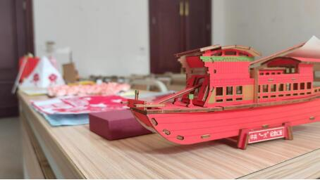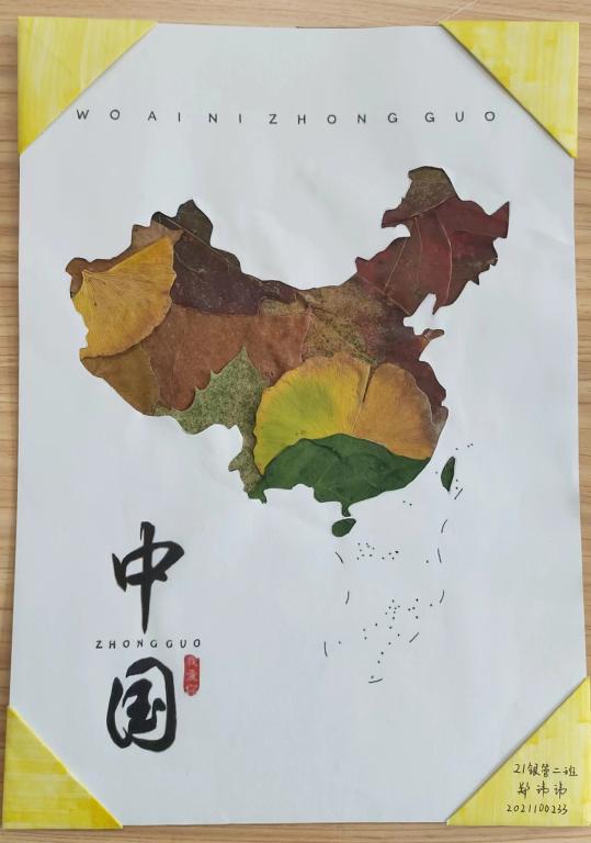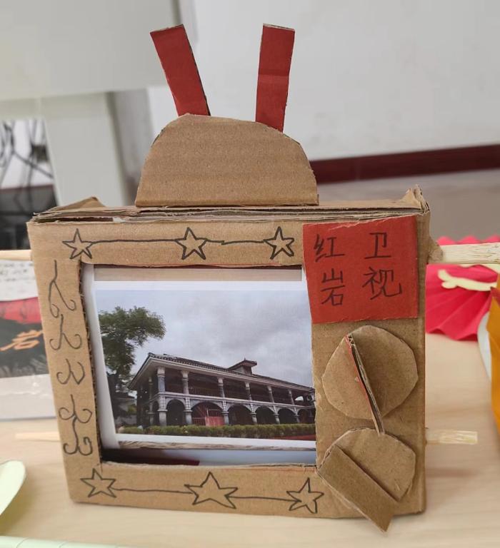 活动成品收集现场整齐地摆放着各位参与活动的同学们的优秀作品:有利用泛黄银杏叶重叠拼凑出的大好河山祖国地图,有结合红纸为底以剪刀裁剪出的传统剪纸作品,有把纸壳为底制作的播放红岩精神电视机等等,作品种类多样,样式繁多。