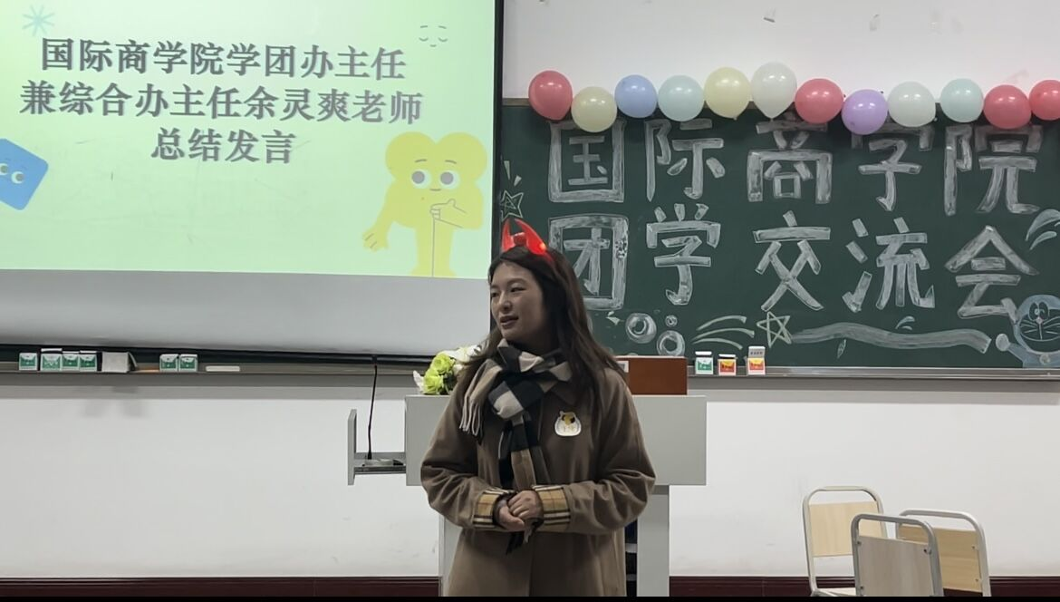 为凝聚团总支、学生会成员力量,有效推动团学工作,进一步提升工作质量,11月30日,我校国际商学院在行政楼1513教室举行2023-2024学年第一学期团总支、学生会“团学交流会”暨总结大会。出席本次活动的嘉宾有国际商学院团总支书记余灵爽、讯飞人工智能学院团总支书记江蕊弘、心理咨询中心吕文梅、学生工作部游思聃以及国际商学院第一届团总支、学生会全体成员。