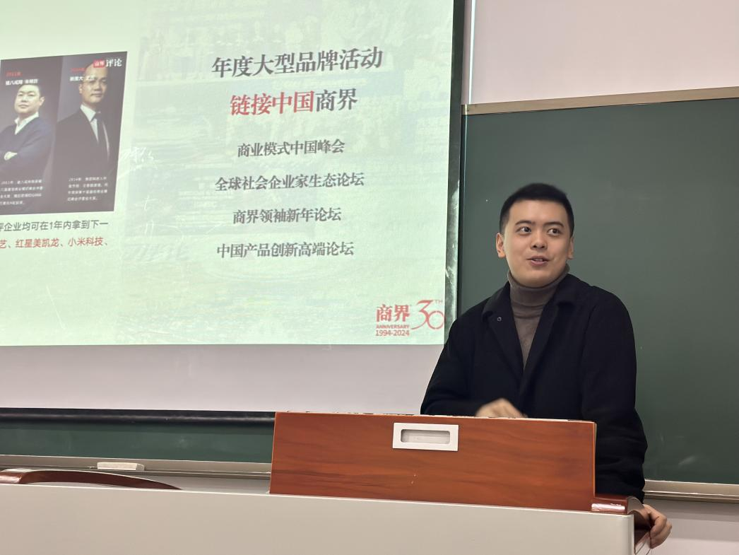 活动伊始,祖雪蛟总经理向学院师生从发展历史、社会影响、公司运营等方面详细介绍了商界集团及商界采编实践基地的相关情况。他提到,商界采编基地作为优质的传媒生实践基地,是由商界青年牵头搭建,致力于协同学校培养适应,市场需求的传媒人才,目前已在重庆、成都、上海等多个城市开设、与多所一流高校达成深度合作,为全面落实推进“校企合作”的教育共识奠定了坚实的根基。同时,他希望广大传媒学子能借商界采编基地提供的采访、撰写、视频剪辑等实践机会进一步提升自身综合能力。