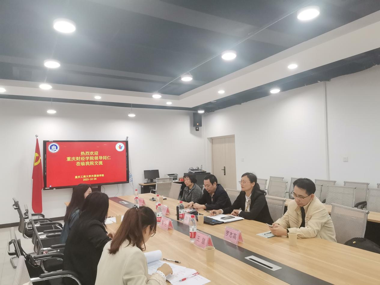 为加强校校间交流合作,共同探讨大学英语教学的创新与发展,10月26日上午,我校国际商学院院长黄兰协同大学英语基础课教研室主任王慧、大学英语拓展课教研室主任王梦莎一行受邀前往重庆工商大学外语学院进行交流学习。重庆工商大学外语学院刘繁副院长、大学英语教学部罗志高教授、语言实验中心陈邦伟老师以及教学管理处谢宗仙老师参会接待。