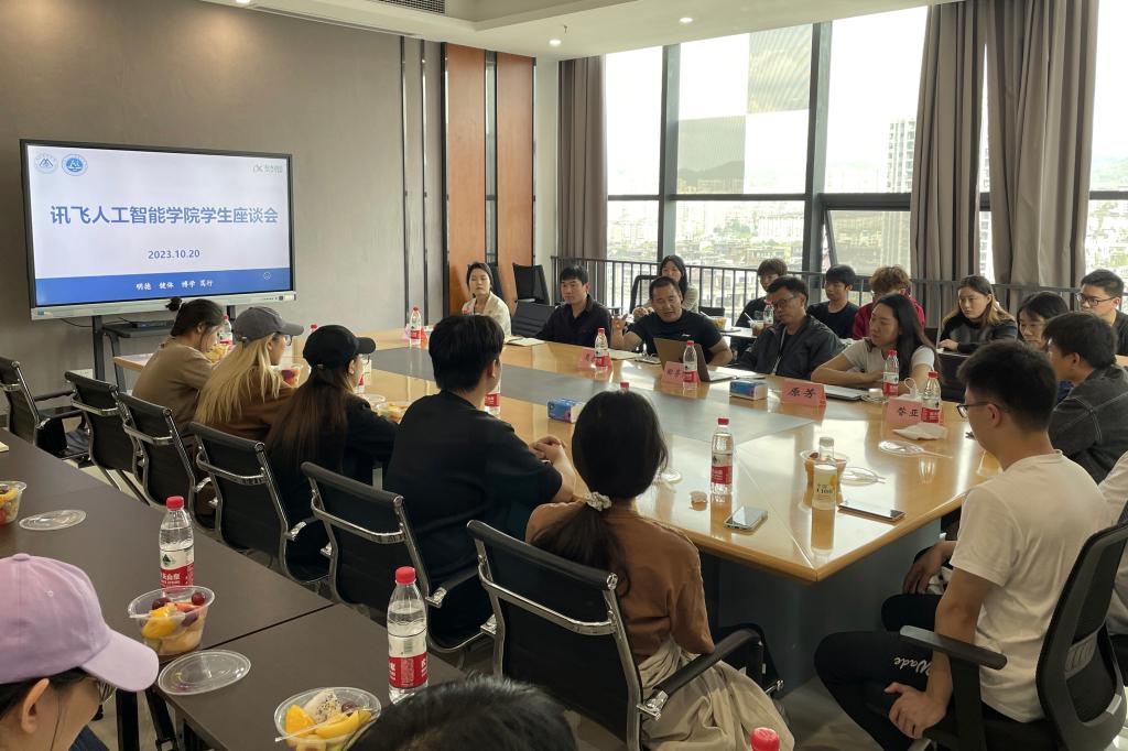 为更好地了解学生的学习和生活,全面听取同学们对教学、管理、服务等各方面的意见和建议,解决广大学生所需所想所愿,提高学院教育教学质量。10月20日下午,我校讯飞人工智能学院在科教城融云楼8楼会议室召开师生座谈会。学院院长周启刚、副院长田荣阳、副院长艾军勇、综合办公室主任原芳、2021级全体辅导员及学生代表参加本次座谈会。