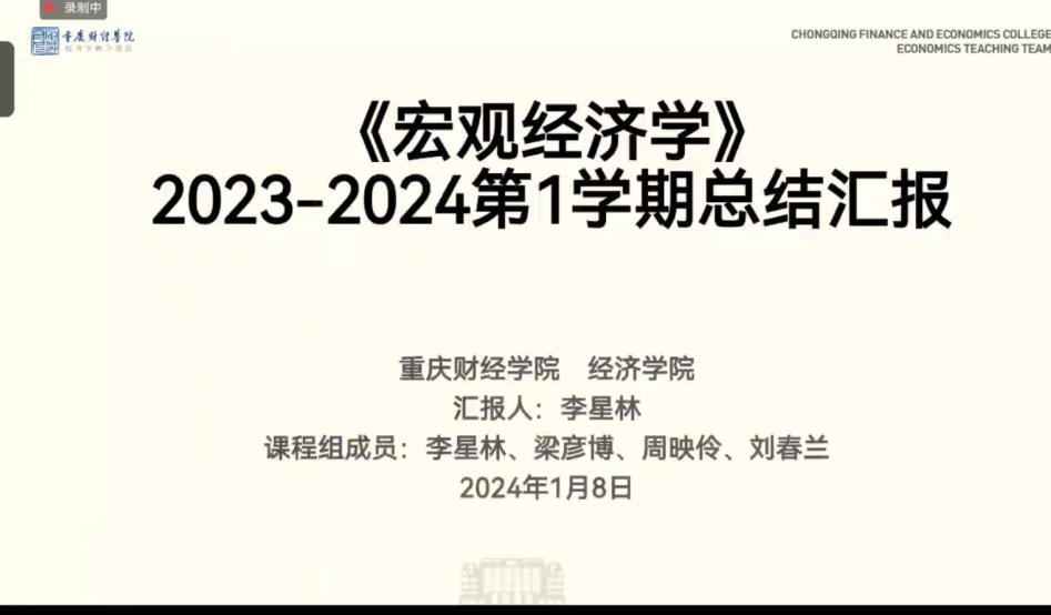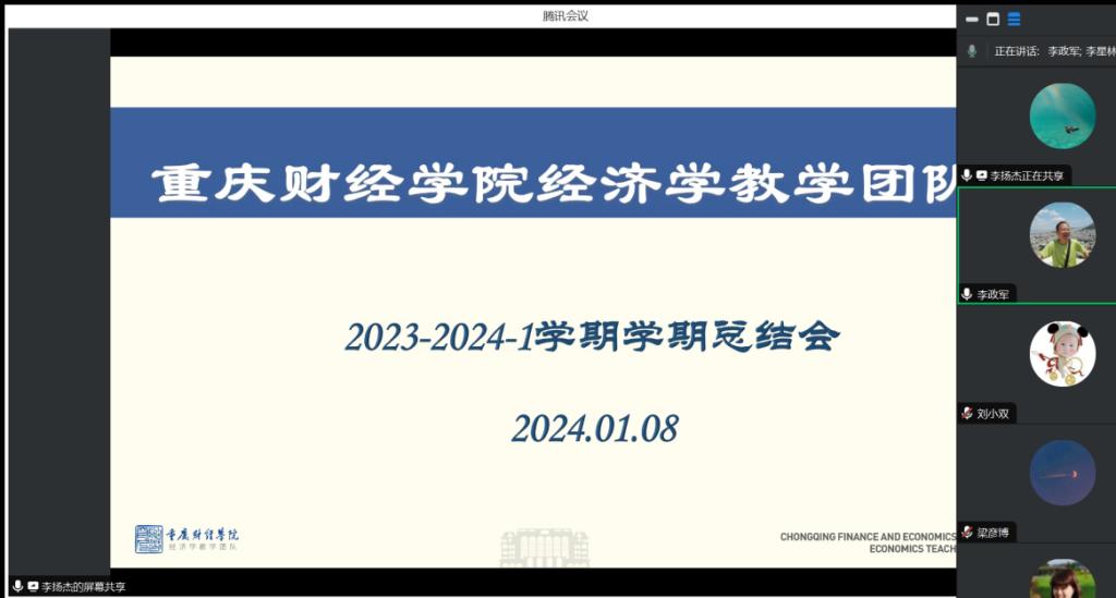 1月8日上午10:30-12:30,我校经济学教学团队在腾讯会议开展2023-2024学年第1学期学期总结会。经济学院院长李政军教授、团队队长刘春兰、宏观经济学组长李星林、经济学原理组长周映伶、政治经济学组长刘小双以及团队全体教师参加了此次总结会议。