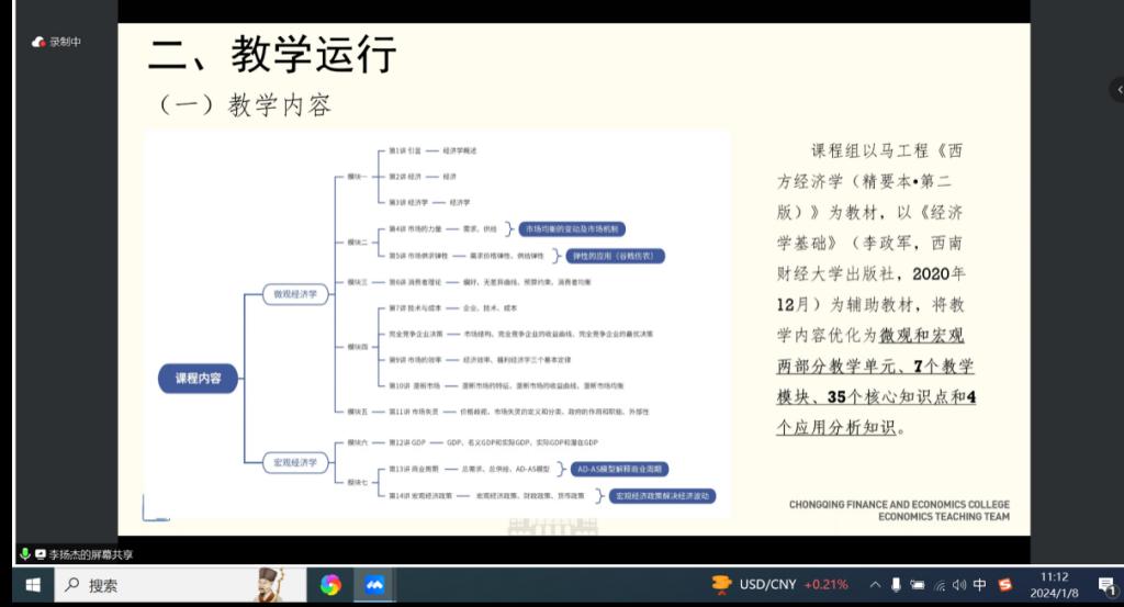 会议第一阶段,各课程组组长分别就本学期的教学运行情况进行了详细的汇报。首先,潘曦老师就本学期《微观经济学》课程情况进行汇报总结,她指出,本期的课程改革主要注重教学过程中对每一个学生的思维培养与强化,通过这样的改革,学生不仅能够掌握经济学的基本原理和方法,还能够培养出独立思考和解决问题的能力;李扬杰老师则对本学期专升本专业《经济学原理》课程的教学运行与教学效果进行了汇报总结,同时分享了一些成功的教学经验和教学案例,为其他教师提供了有益的参考;李星林老师对《宏观经济学》课程的教学运行情况、课程建设情况进行汇报,并对未来工作进行展望;最后,《政治经济学》课程组组长刘小双老师从课程建设、课程改革、学生学习情况进行总结汇报,分析了当前教学中存在的问题和不足,并提出了有针对性的改进措施和建议。