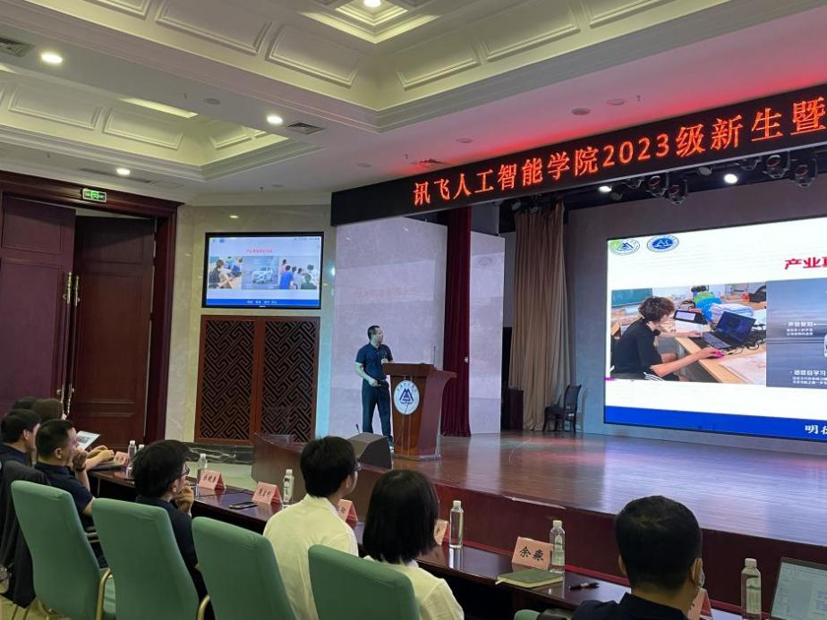 首先,周启刚院长致欢迎辞,对学院300余名新生表示热烈的欢迎。随后他围绕学院发展历程、学院师资队伍情况、科研平台情况、产教融合教学特色、专业活动、学生活动等六个方面介绍了讯飞人工智能学院的基本情况。希望同学们在讯飞人工智能学院能够学有所获、学有所得。
