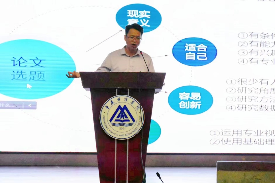蒋金满博士围绕毕业论文选题的意义和要求、选题的原则和常见问题、选题的基本方法、选题的技巧、选题的实操和建议五个方面展开讲解。并通过展示具体案例为同学们分析了如何优化毕业论文选题,他表示,毕业论文选题要具有创新性与专业性,符合选题标准,体现时代色彩。