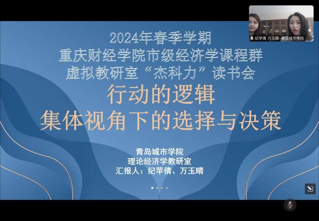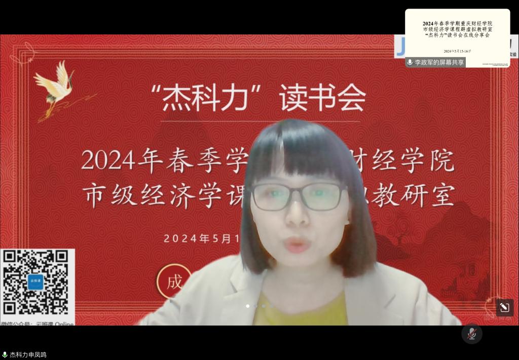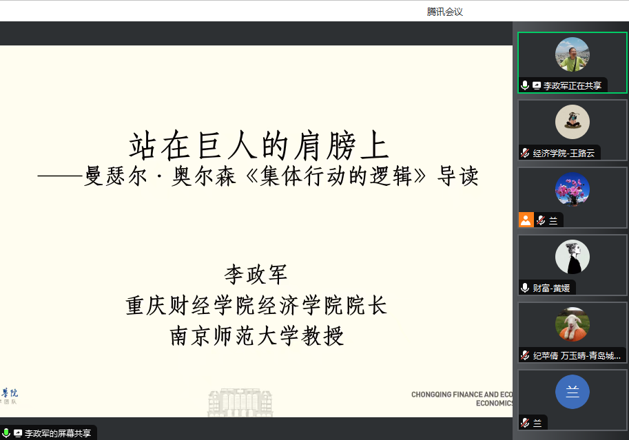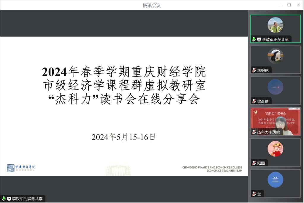 5月15日上午,我校市级经济学课程群虚拟教研室与青岛城市学院工商管理学院联合开展2023年春季学期“杰科力”线上读书分享会。本次读书会的阅读书目为曼瑟·奥尔森《集体行动的逻辑》。我校经济学教学团队首席教授李政军、经济学教学团队全体成员,青岛城市学院工商管理学院理论经济学课程组纪苹倩和万玉晴老师,以及读书会赞助方成都杰科力科技公司院校事业部经理孙凤鸣女士参加读书会。读书会共计吸引校内外40余名老师在线倾听交流。