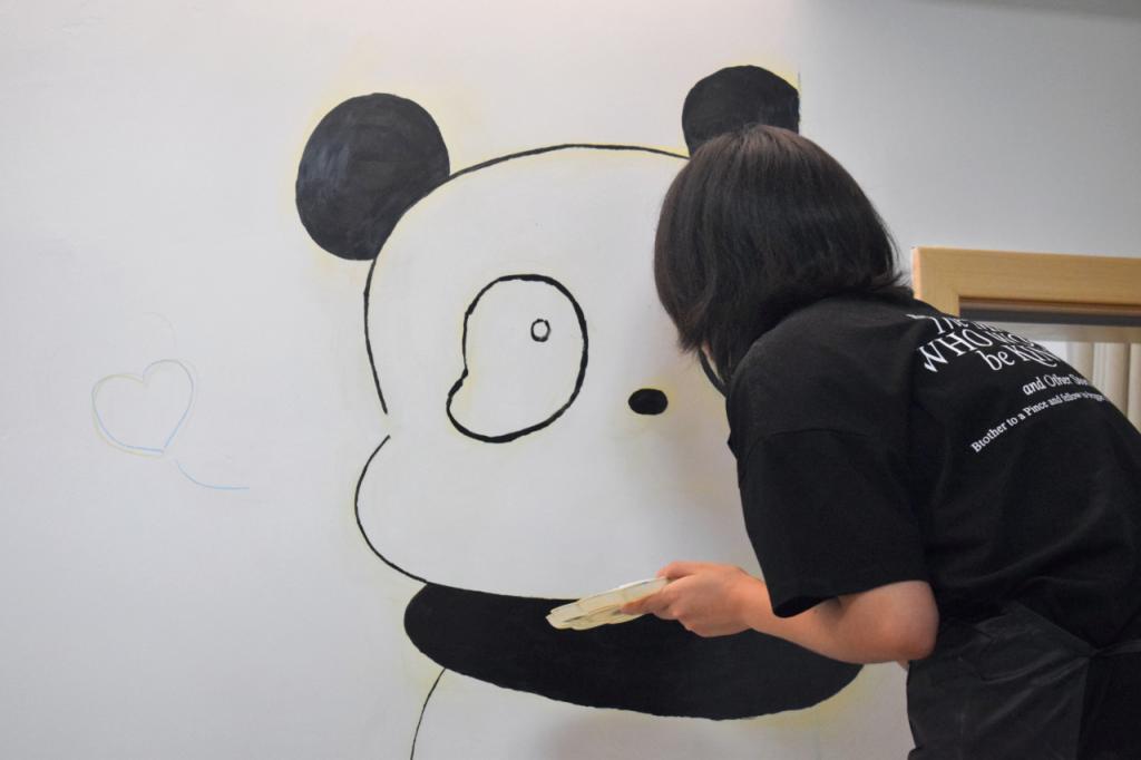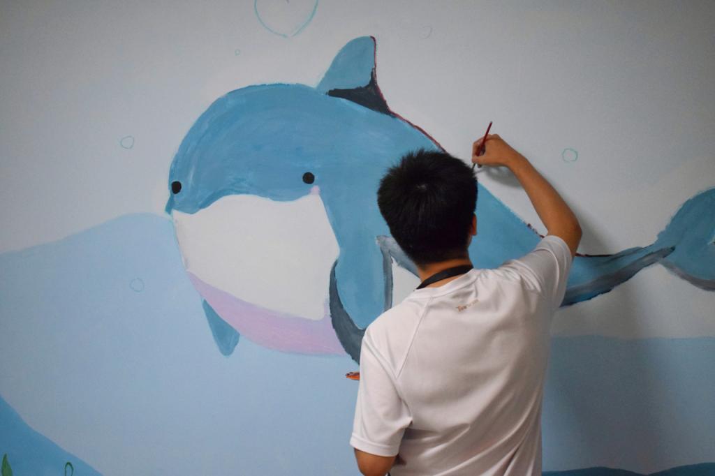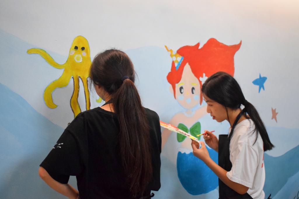 活动期间,志愿者们认真的整理卫生服务中心的办公室和接种室,为绘画留下了充足的空间。随后,志愿们开始不断调和颜料,用毛笔在墙面上勾勒、点缀、绘画,通过一支画笔,一面墙壁,为严肃沉重的场景新添了一抹“人情味”,将一幅幅温馨可爱的壁画呈现出来。