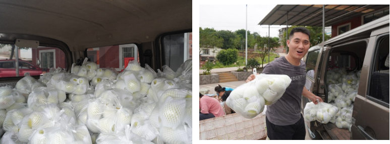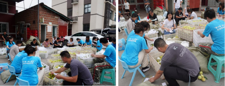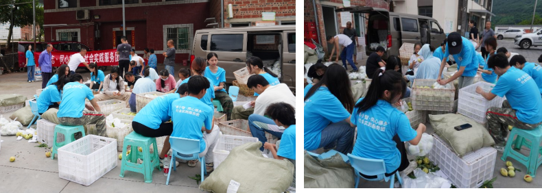 为了保持桃子的新鲜度和口感,香桃需包装套袋送去顾客手中,为确保运输车来临之前,2000余斤仙池香桃全部包装完毕。仙池村村干部、村民,“青小志·同心振乡”社会实践服务团师生全力拼搏,最终将6630余个桃子在1小时内经过一一挑选、装袋,让390余袋、2000余斤香桃顺利启航。