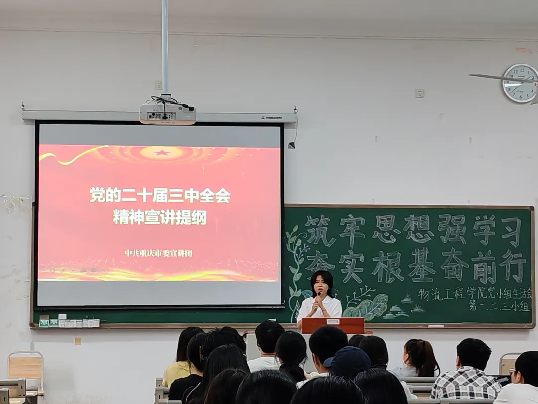 为了深入贯彻党的二十届三中全会精神,让全体师生深刻领悟会议的重要意义和内涵,我校物流工程学院在全院开展“学习二十届三中全会精神,共绘青春奋斗新篇章”系列宣讲。学生党支部第一讲于9月25日中午12:30在教学楼1620教室展开。本次宣讲会由学院专职组织员罗贤老师主讲,学院全体学生党员,入党积极分子及党员服务站全体工作人员参会。