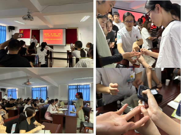 校内+校外,全面系统培训。为确保实训顺利启动,学院领导、专业教师、学工队伍老师、社区医院医师及社区工作人员共同参与,通过校内+校外的培训形式,对参与实训的学生进行了全面系统的培训。9月29日,学院团总支书记阳圆、专任教师张啟带领30名学生在莲花街道石洋社区进行了实训前的培训。社区医师杨素芳医师和许露丹以老年人群常见慢性疾病的高血压与糖尿病为例,为同学们详解介绍症状体征、科学测量方法、有效预防措施以及可能引发的并发症。同时,还实践教学指导学生正确使用血压仪、血糖监测仪器等。