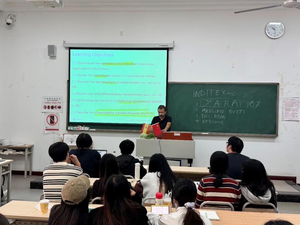 10 月 14日,为全面推进工业工程中外合作项目,丰富学生多元化、国际化的学习体验,帮助学生开拓国际化视野、增强国际化意识、学好专业知识。在我校与拉科鲁尼亚大学共同推动下,Alejandro Manuel Fernández Castro(亚历杭德罗·曼努埃尔·费尔南德斯·卡斯特罗)教授跨越7000余公里从西班牙到重庆为我校工业工程(中外合作办学)2023级学生讲授《企业组织》课程。