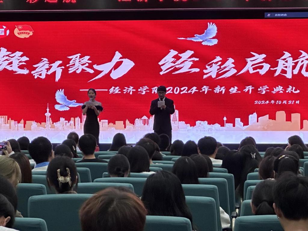 秋光为序,筑梦启航;新学肇始,万象更新。为了增进“学院-学生、老师-学生、学生-学生”之间认识了解,帮助同学们更好认识大学、感受大学,增强凝聚力和向心力,10月21日下午,我校经济学院新生开学典礼在学术报告厅隆重举行。学院党政领导、辅导员老师、专职教师及经济学院2024级学生参加。冉露和李涛担任主持人。