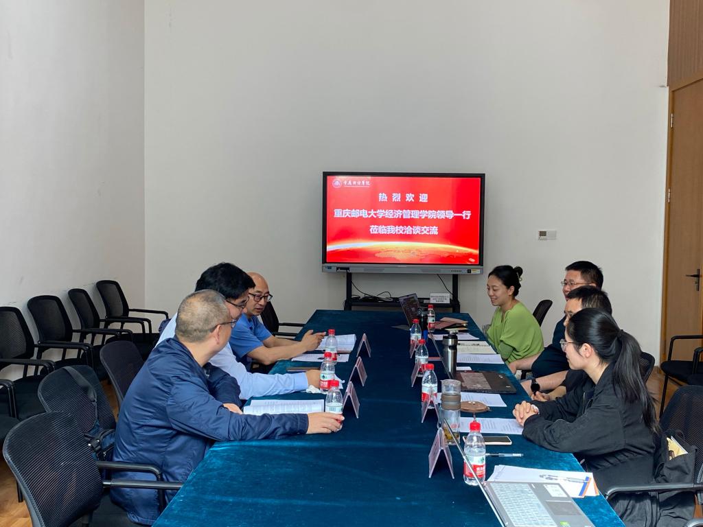 会上,贺晗院长代表学院对重庆邮电大学经济管理学院一行来访表示欢迎,并从发展历程、特色优势、师资队伍、人才培养等方面介绍了学院发展的整体情况。张鹏副院长介绍了重庆邮电大学经济管理学院近年来的发展情况。田东处长介绍了市级产教融合特色优势专业群项目基本情况。此后,双方开展了深入交流,就党建共建、课程资源、师资团队、人才培养、学科竞赛、实习基地等方面达成合作意向,下一步将围绕项目任务形成具体可落地的方案,共同推动数字金融产教融合特色优势专业群项目建设。