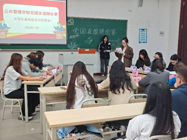 为深入学习贯彻习近平新时代中国特色社会主义思想和党的二十届三中全会精神,增强党团组织的凝聚力和向心力,引导广大学生形成正确择业观念、提升思辨能力,培养爱党爱国情怀,11月4日中午,我校公共管理学院学生党支部在教学楼1408教室开展了一场辩题为“大学生是先就业VS先择业”的党团友谊辩论赛。