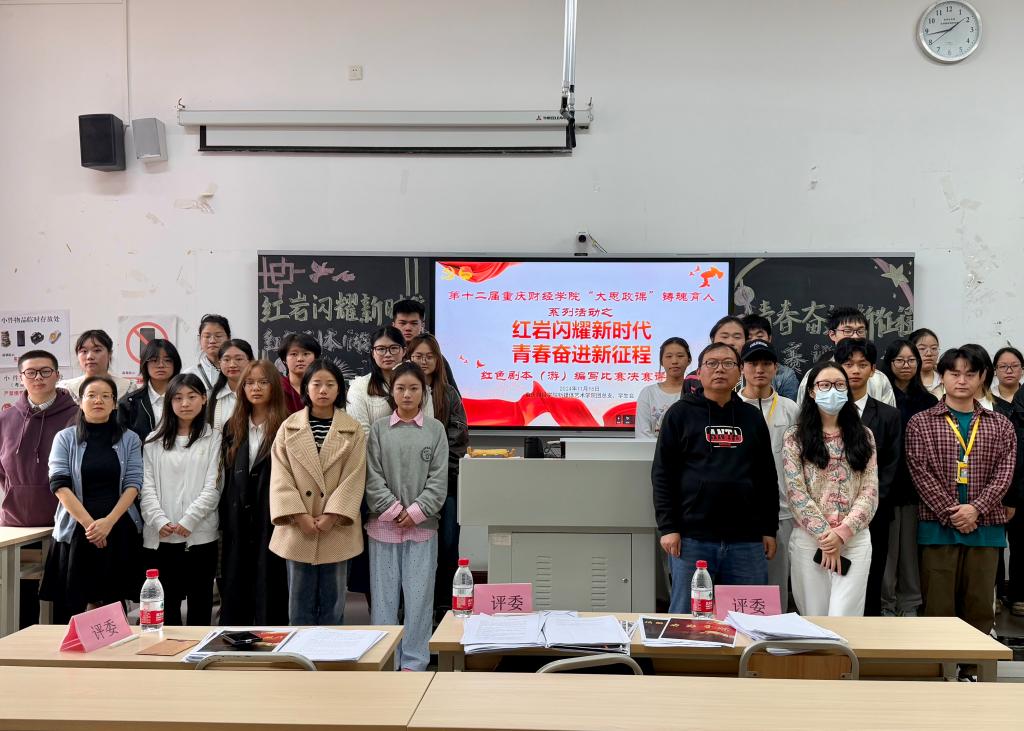 为传承弘扬红岩精神,激发青年在新时代奋进的青春力量,推动我校思想政治教育创新,由马克思学院主办、新媒体艺术学院承办的第十二届“大思政课”铸魂育人活动之“红岩闪耀新时代,青春奋进新征程”红色剧本(游)编写比赛决赛于11月15日在教学楼1502教室成功举行。出席本次活动的评委嘉宾有陈开江老师、甘雪梅老师、彭玉琳老师。