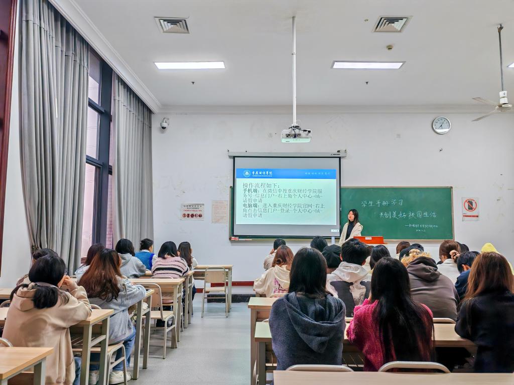 在线下集中学习《学生手册》主题班会中,学院两位新生班级辅导员就学生手册相关重要内容进行了详细解读,包括学业,安全、纪律、宿舍、奖助学金等方面的规定以及学生的权利与义务。其中辅导员蒋老师在主题班会中强调,学生手册不仅是学校管理的依据,更是每位学生行为的指南。
