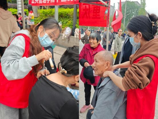 在中医理疗和艾灸环节,体验区排起了长队。在专业老师的指导下,同学们运用所学的推拿手法,为居民们缓解肩颈疼痛、放松肌肉。艾灸的温热烟雾弥漫在空气中,为居民们驱散了身体的寒湿之气。一位居民在体验完推拿后,笑着说:“感觉浑身轻松,这些孩子们的手法真不错,中医还是很有用的。”同学们在实践中不断提高自己的操作技能,将中医药的温暖传递给了每一位居民,让居民们感受到了中医药文化的独特魅力。最后,健康服务与管理专业综合实训团队还为居民准备了特别的小礼品——具有温通经络、散寒祛湿功效的足浴包和帮助缓解肌肉紧张,疏通气血艾草五子锤,将健康与温暖传递到每一位居民手中。