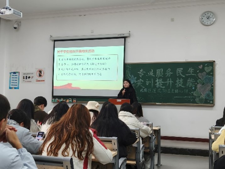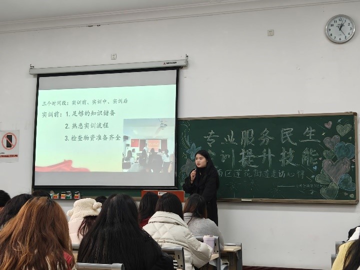 随后,赵艺同学从四个方面深入讲解了如何有效参与社区服务活动,提升专业实训技能。她详细阐述了在社区服务中,工作人员应具备的沟通技巧、问题解决能力以及对政策法规的熟练运用能力。这些实践经验不仅为在场的同学提供了宝贵的指导,更为大家未来的工作指明了方向。