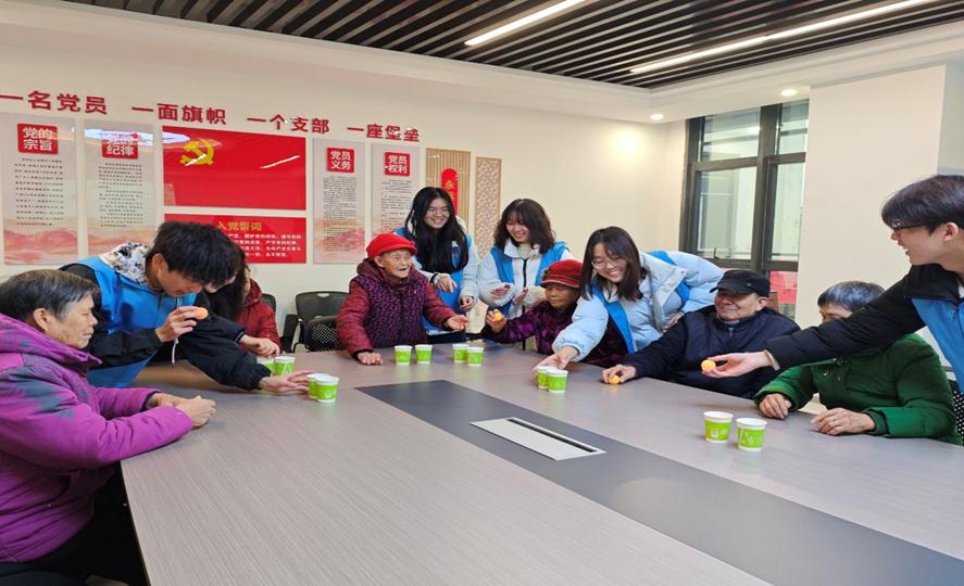 志愿者们和老人们一起参与互动游戏乒乓球投壶和吹纸杯。整个游戏过程中,大家互动交流,分享着彼此的生活经验与感悟,建立起跨越年龄界限的深厚情谊。