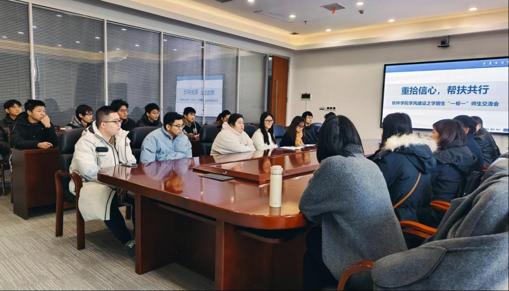 为深化师生交流互动,构建精准帮扶体系,携手促进学业困难学生(以下简称“学困生”)成绩提升,营造一种积极向上、互助共进的学习氛围。12 月 23 日,我校软件学院在行政楼2303会议室开展学困生 “一帮一” 师生交流会,副院长夏祥礼、党总支副书记刘有沛,教师代表王莉莉、左智科、江维琼、蒋丽丽和14名学困生参与。