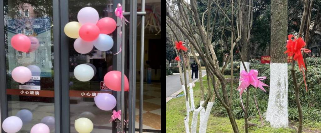 在7栋和13栋楼下,两条醒目的横幅迎风飘扬,标语“辞旧迎新同聚舍,携手共进启新程”和“归巢学子情暖舍,齐心奋进共成长”寄托了学院对同学们新学期的美好祝愿。楼栋大门用五彩缤纷的气球装饰,道路两旁的草木也披上了拉花,整个宿舍区洋溢着喜庆与活力的气息。
