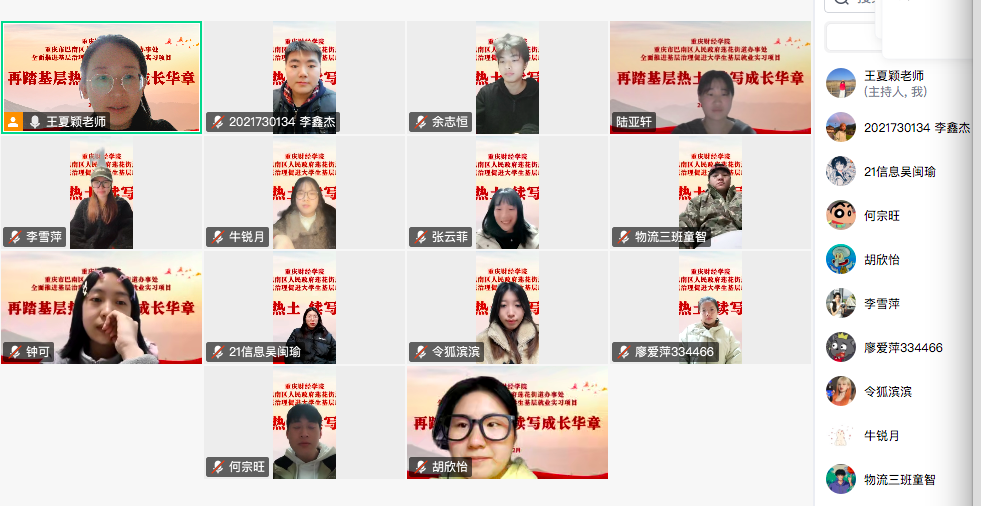 为深入贯彻国家关于引导高校毕业生服务基层的决策部署,深化校地协同育人机制,近日,我校软件学院召开大学生基层实习中期线上推进会。软件学院团总支书记王夏颖与13名参与巴南区基层岗位实习的学生齐聚云端,总结实践成果,共话责任担当,为后续服务基层蓄力赋能。